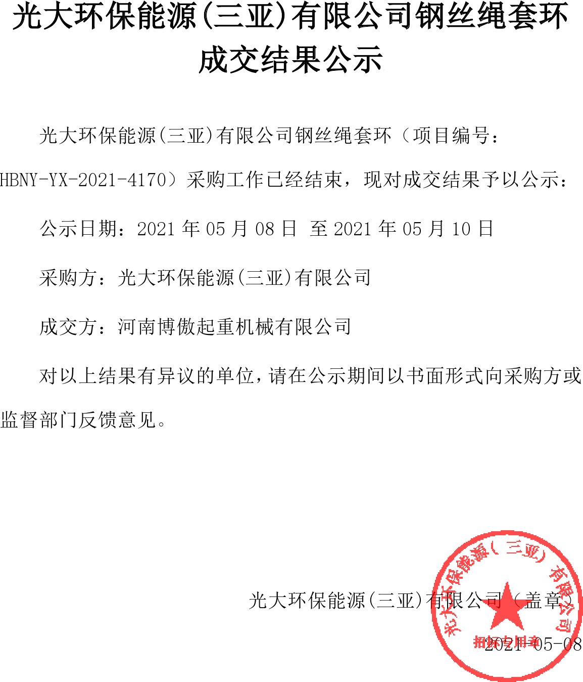 移動版:海南:光大環(huán)保能源(三亞)有限公司鋼絲繩套環(huán)成交結果公示