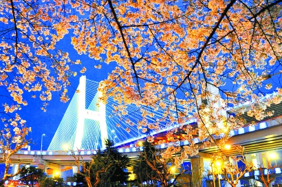 櫻花季,在南浦大橋下的網(wǎng)紅公交樞紐站點觀賞南浦大橋,風景如詩如畫。 視覺中國