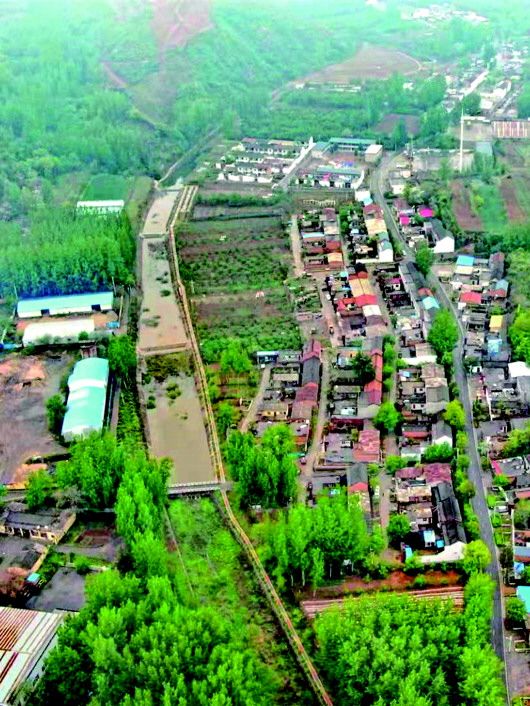 河南省“全國(guó)文明村”河口村人工濕地污水流入的燕溝河(4月25日攝,無人機(jī)照片)。新華社記者 劉詩(shī)平 攝