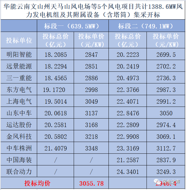 近期,華能云南1388.6MW風(fēng)電項(xiàng)目公布投標(biāo)報(bào)價(jià)。在第二標(biāo)段中,明陽智能報(bào)出了2699.5元/KW,遠(yuǎn)景能源報(bào)出2702.2元/KW的含塔筒報(bào)價(jià)。
