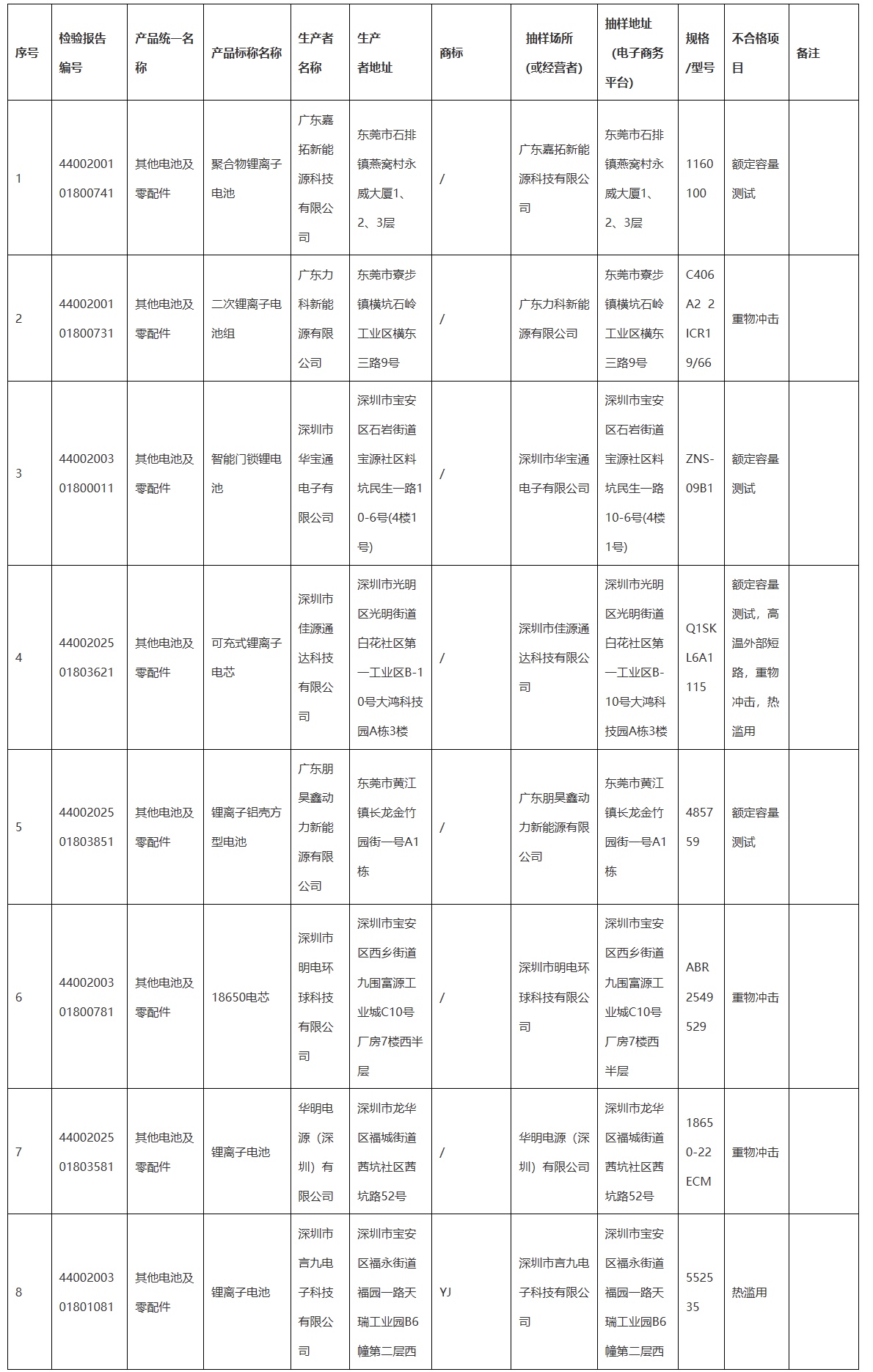 5月25日,廣東省市場(chǎng)監(jiān)督管理局發(fā)布2020年度廣東省電池產(chǎn)品質(zhì)量監(jiān)督抽查情況的通告,本次共對(duì)155家企業(yè)生產(chǎn)的鋰離子電池、其他電池及零配件等2類346款電池及其零部件產(chǎn)品質(zhì)量開展了監(jiān)督抽查,發(fā)現(xiàn)廣東嘉拓新能源、廣東力科新能源、深圳市華寶通電子、深圳市佳源通達(dá)、廣東朋昊鑫動(dòng)力、深圳市明電環(huán)球、華明電源、深圳市言九電子等8家電池企業(yè)生產(chǎn)的8款產(chǎn)品不合格。不合格項(xiàng)目主要有:“額定容量測(cè)試”“重物沖擊”“高溫外部短路”“熱濫用”。