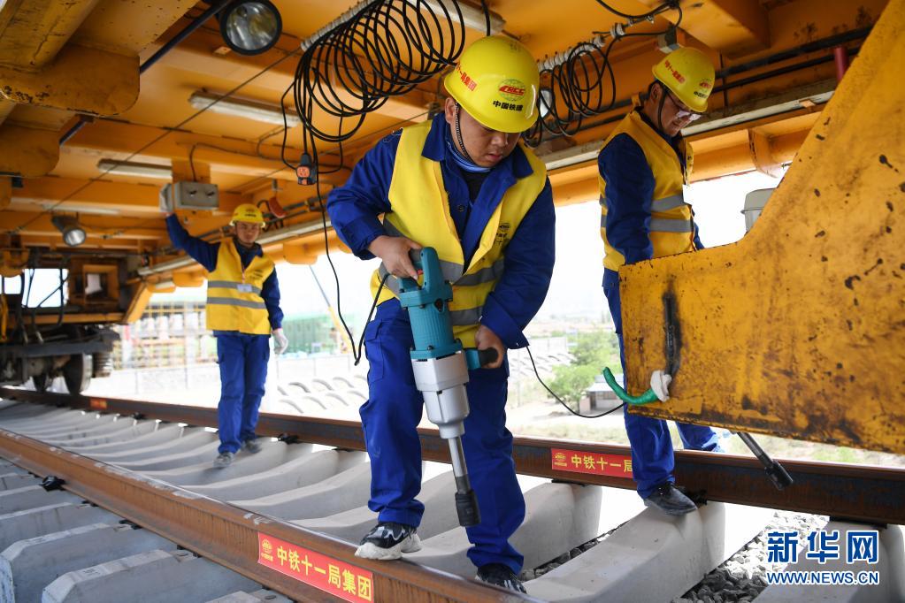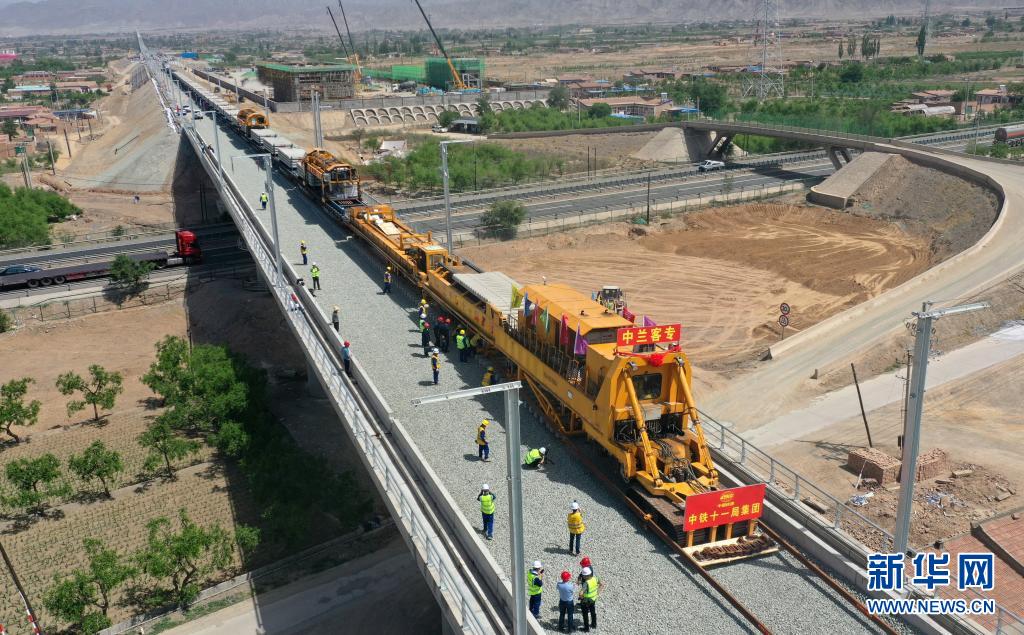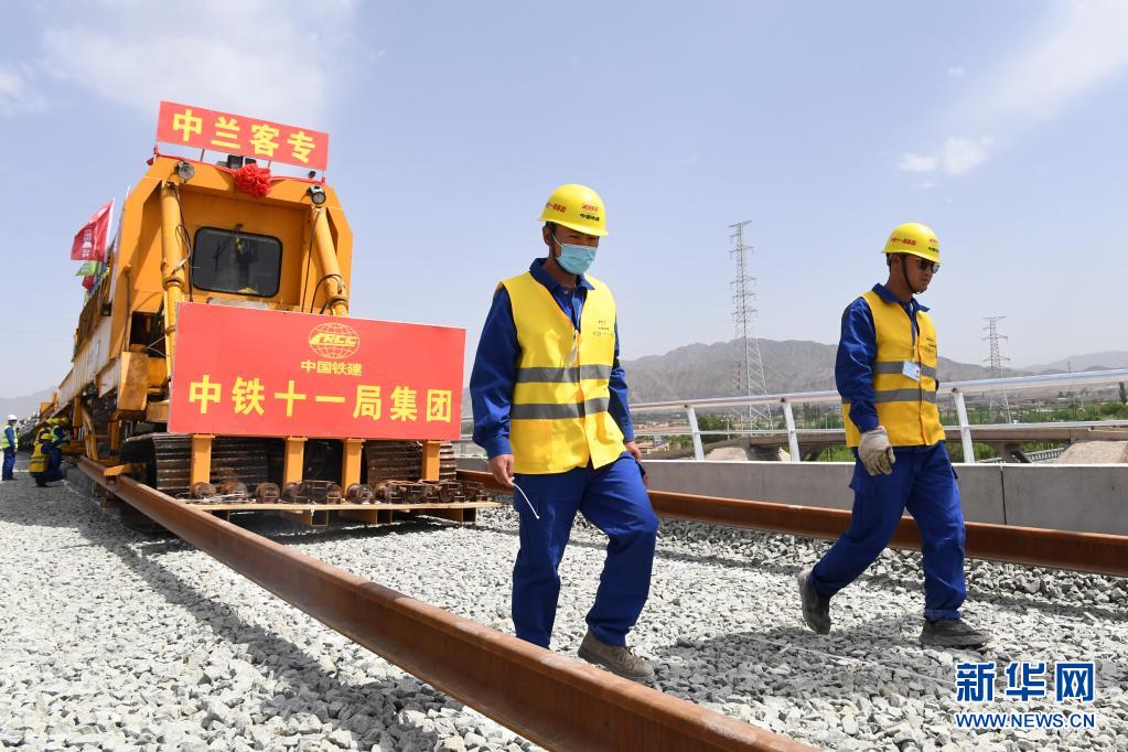 5月30日,中鐵十一局建設(shè)者在中蘭客專甘肅段鋪軌施工現(xiàn)場作業(yè)。 新華社記者 陳斌 攝