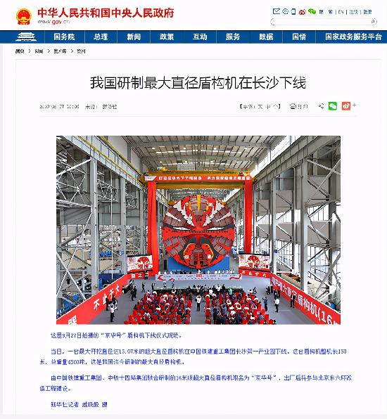國產(chǎn)最大直徑盾構(gòu)機(jī)“京華號”下線,吸引了中國政府網(wǎng)和人民日報(bào)、新華社、中央廣播電視總臺、光明日報(bào)、經(jīng)濟(jì)日報(bào)、科技日報(bào)、中新社、湖南日報(bào)、湖南衛(wèi)視等數(shù)十家中央及地方主流媒體密集采訪報(bào)道。