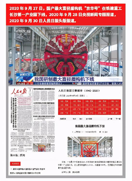 2020年9月30日人民日報(bào)頭版,9月27日新華社,9月27日、28日中央電視臺等中央媒體報(bào)道國產(chǎn)最大直徑盾構(gòu)機(jī)“京華號”在鐵建重工下線。