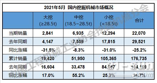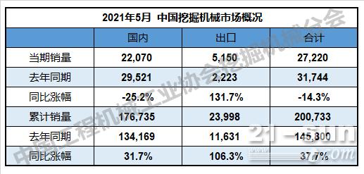 2021年5月,共計(jì)銷(xiāo)售各類(lèi)挖掘機(jī)械產(chǎn)品27,220臺(tái),同比下降14.3%。其中,國(guó)內(nèi)市場(chǎng)銷(xiāo)量22,070臺(tái),同比下降25.2%;出口銷(xiāo)量5,150臺(tái),同比漲幅131.7%。