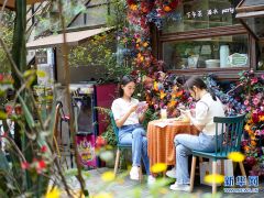 4月22日,在重慶北倉文創(chuàng)街區(qū)內(nèi),游客在一家充滿文藝氣息的飲料店小憩。新華社記者 劉潺 攝