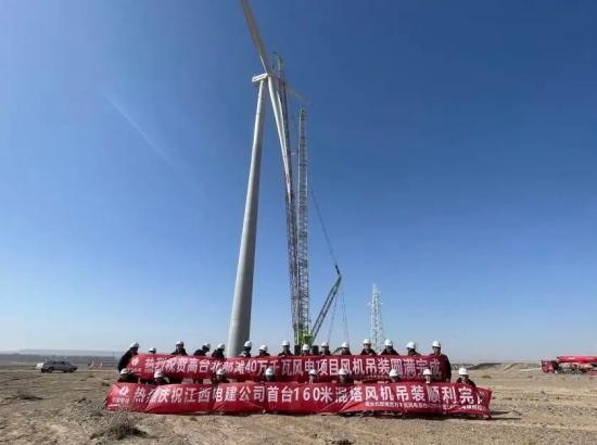 “風雪祁連山,鏖戰(zhàn)河西廊。”高臺北部灘40萬千瓦風電項目坐落甘肅省張掖市高臺縣西北部,河西走廊中部,黑河中游下段,地處巴丹吉林沙漠南緣,線路總長92.367公里,裝機總?cè)萘繛?00兆瓦,其間輪轂高度105米鋼塔筒機組32臺、輪轂高度120米鋼混合塔筒機組31臺、輪轂高度160米高混塔機組1臺,共計64臺風力發(fā)電機組。