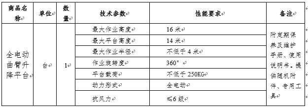 采購全電動曲臂升降平臺1臺(提供隨機附件、專用工具)。
