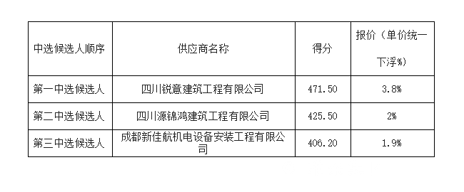 1.根據(jù)綜合評(píng)分法,我單位確定四川銳意建筑工程有限公司成為本次采購項(xiàng)目的中選供應(yīng)商。