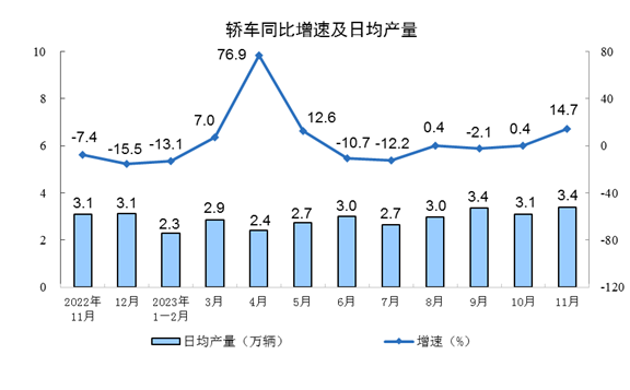分行業(yè)看,11月份,41個(gè)大類行業(yè)中有28個(gè)行業(yè)增加值保持同比增長(zhǎng)。其中,煤炭開采和洗選業(yè)增長(zhǎng)5.2%,石油和天然氣開采業(yè)增長(zhǎng)1.8%,農(nóng)副食品加工業(yè)下降0.5%,酒、飲料和精制茶制造業(yè)增長(zhǎng)4.8%,紡織業(yè)增長(zhǎng)2.1%,化學(xué)原料和化學(xué)制品制造業(yè)增長(zhǎng)9.6%,非金屬礦物制品業(yè)下降0.6%,黑色金屬冶煉和壓延加工業(yè)增長(zhǎng)5.1%,有色金屬冶煉和壓延加工業(yè)增長(zhǎng)10.2%,通用設(shè)備制造業(yè)增長(zhǎng)0.8%,專用設(shè)備制造業(yè)增長(zhǎng)1.9%,汽車制造業(yè)增長(zhǎng)20.7%,鐵路、船舶、航空航天和其他運(yùn)輸設(shè)備制造業(yè)增長(zhǎng)12.7%,電氣機(jī)械和器材制造業(yè)增長(zhǎng)10.2%,計(jì)算機(jī)、通信和其他電子設(shè)備制造業(yè)增長(zhǎng)10.6%,電力、熱力生產(chǎn)和供應(yīng)業(yè)增長(zhǎng)9.2%。