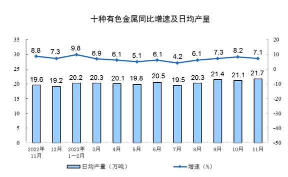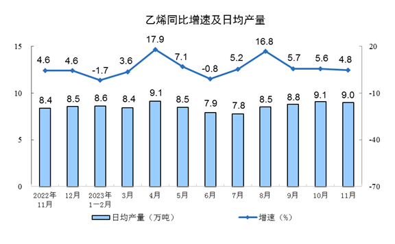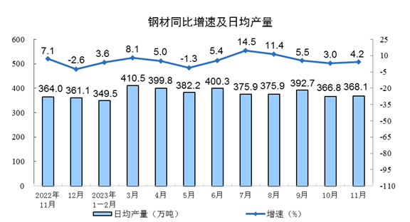 分產(chǎn)品看,11月份,620種產(chǎn)品中有367種產(chǎn)品產(chǎn)量同比增長(zhǎng)。其中,鋼材11044萬噸,同比增長(zhǎng)4.2%;水泥18979萬噸,增長(zhǎng)1.6%;十種有色金屬650萬噸,增長(zhǎng)7.1%;乙烯269萬噸,增長(zhǎng)4.8%;汽車295.3萬輛,增長(zhǎng)23.6%,其中新能源汽車100.6萬輛,增長(zhǎng)35.6%;發(fā)電量7310億千瓦時(shí),增長(zhǎng)8.4%;原油加工量5953萬噸,增長(zhǎng)0.2%。