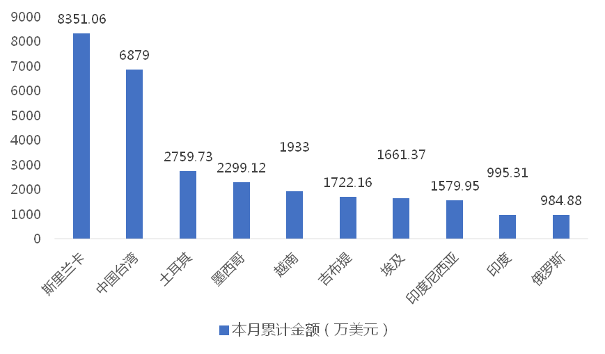 1-6月,我國龍門式起重機(jī)出口金額排名前十的國家/地區(qū)分別為斯里蘭卡、中國臺灣、土耳其、墨西哥、越南、吉布提、埃及、印度尼西亞、印度、俄羅斯,合計占我國該產(chǎn)品出口總額的82.34%。其中,向斯里蘭卡出口最多,金額為8351.06萬美元,占出口總額的23.58%。