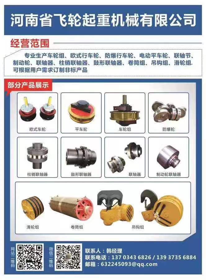 聯(lián)系熱線:河南省飛輪起重機(jī)械有限公司,專業(yè)生產(chǎn)車輪組|歐式車輪組|防爆行車輪|電動(dòng)平車輪|聯(lián)軸接|制動(dòng)輪聯(lián)軸器|柱銷聯(lián)軸器|鼓型聯(lián)軸器|卷筒組|吊鉤組|滑輪組等雙梁起重產(chǎn)品,可根據(jù)用戶需求定制雙梁起重配件。 選擇飛輪起重是正確的選擇,我們期待與您達(dá)成合作!
