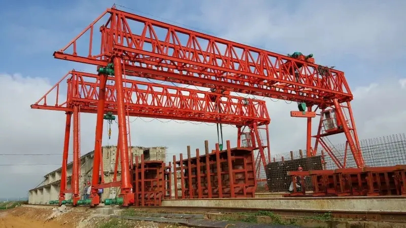 它的金屬結(jié)構(gòu)像門形框架,承載主梁下安裝兩條支腳,可以直接在地面的軌道上行走,主梁兩端可以具有外伸懸臂梁。