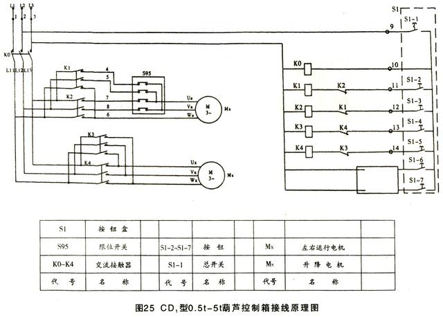 代號(hào)及名稱(chēng):S1按鈕盒、S95限位開(kāi)關(guān)、KO-K4交流接觸器、S1-2~S1-7按鈕、S1-1總開(kāi)關(guān)、Mx左右運(yùn)行電機(jī)、Ms升降電機(jī)。