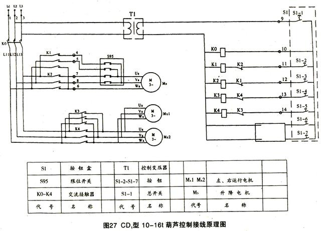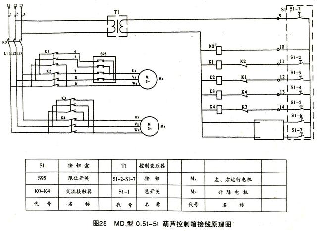 代號(hào)及名稱(chēng):S1按鈕盒,S95限位開(kāi)關(guān),KO-K4交流接觸器,T1控制變壓器,S1-2~S1-7按鈕,S1-1總開(kāi)關(guān),Mx 左、右運(yùn)行電機(jī),Ms升降電機(jī)。