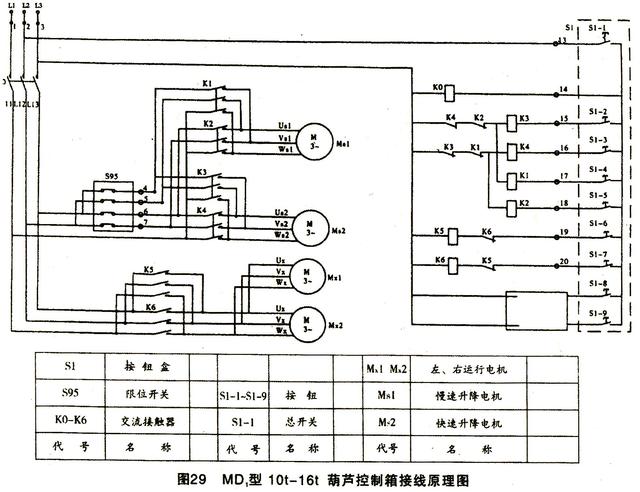 代號(hào)及名稱(chēng):S1按鈕盒,S95限位開(kāi)關(guān),KO-K6交流接觸器,S1-1~S1-9按鈕,S1-1總開(kāi)關(guān),Mx1 Mx2 左、右運(yùn)行電機(jī),Ms1慢速升降電機(jī)、Ms2快速升降電機(jī)。